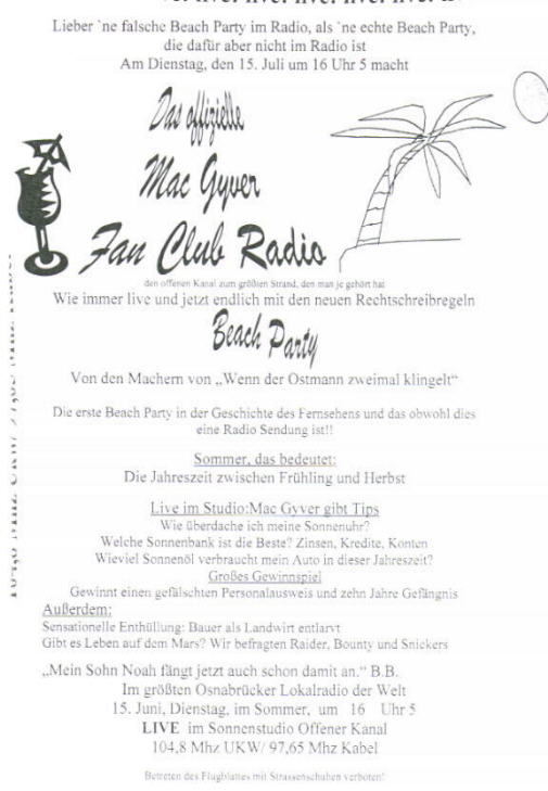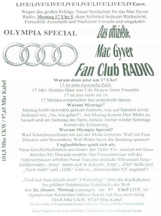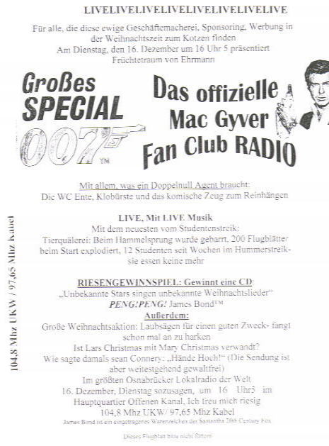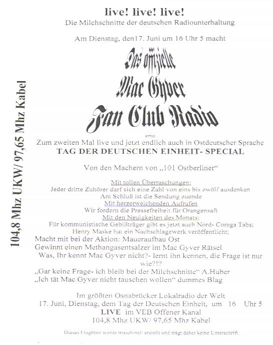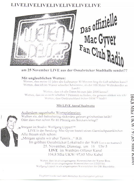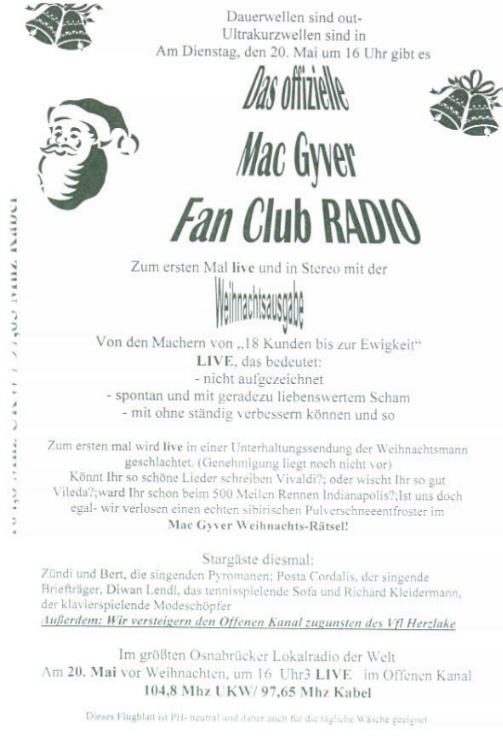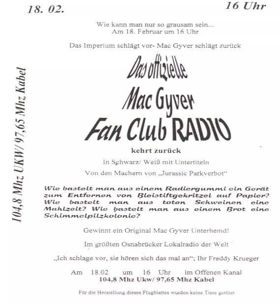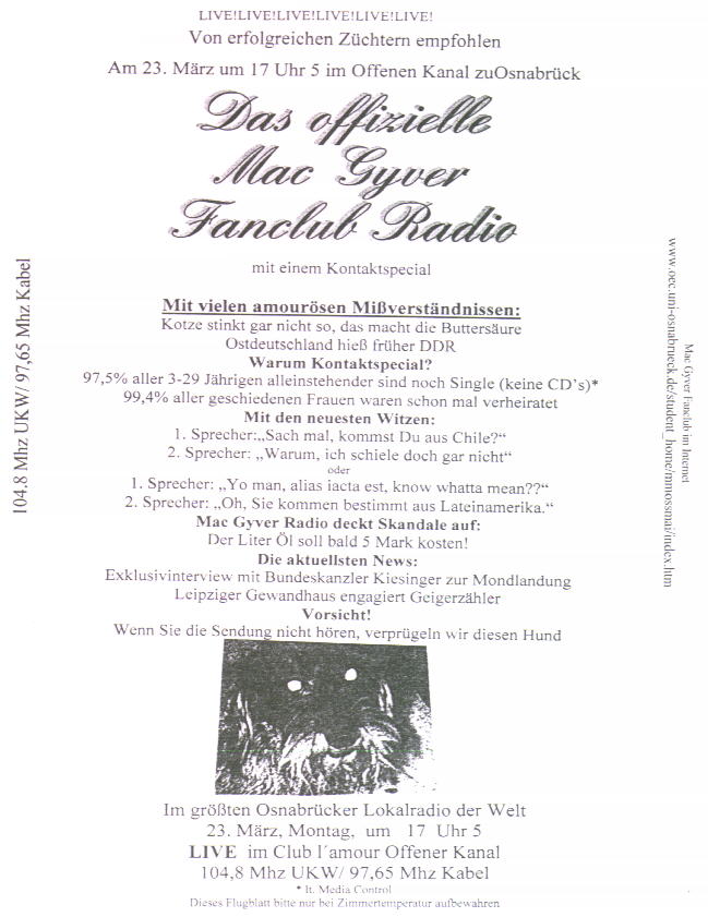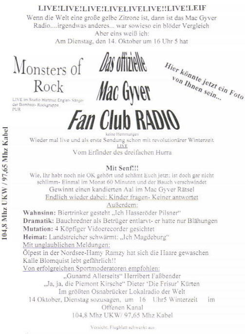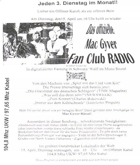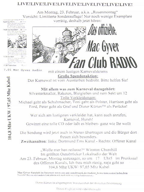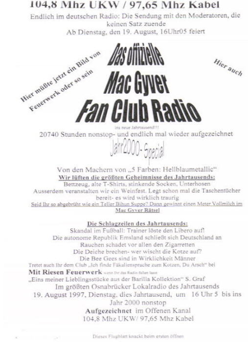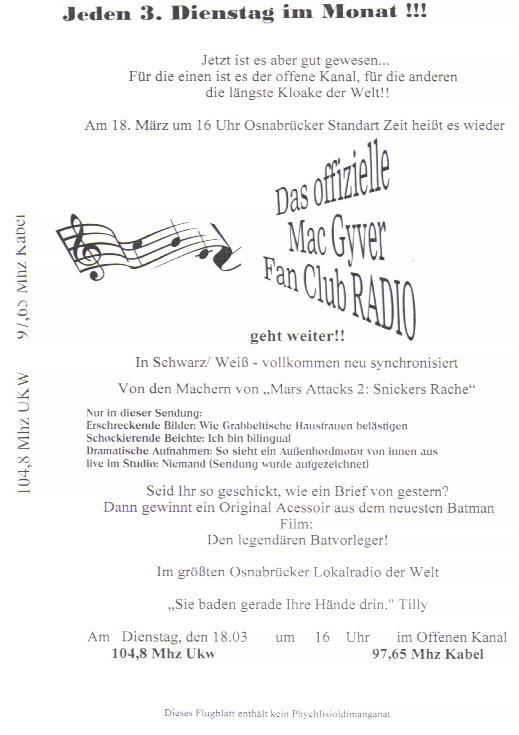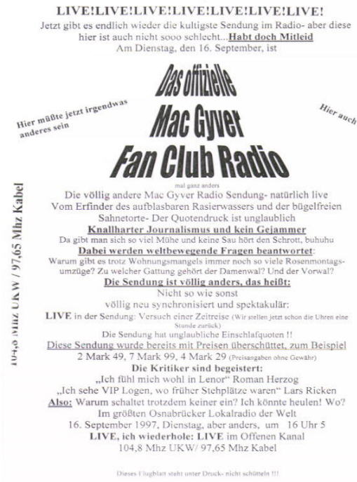 Mac Gyver Radio- Es kam ja alle 4 Wochen Montags von 17 Uhr 5 bis 18 Uhr LIVE im Offenen Kanal Osnabrück auf 104,8 Mhz UKW bzw 97,65 Mhz Kabel